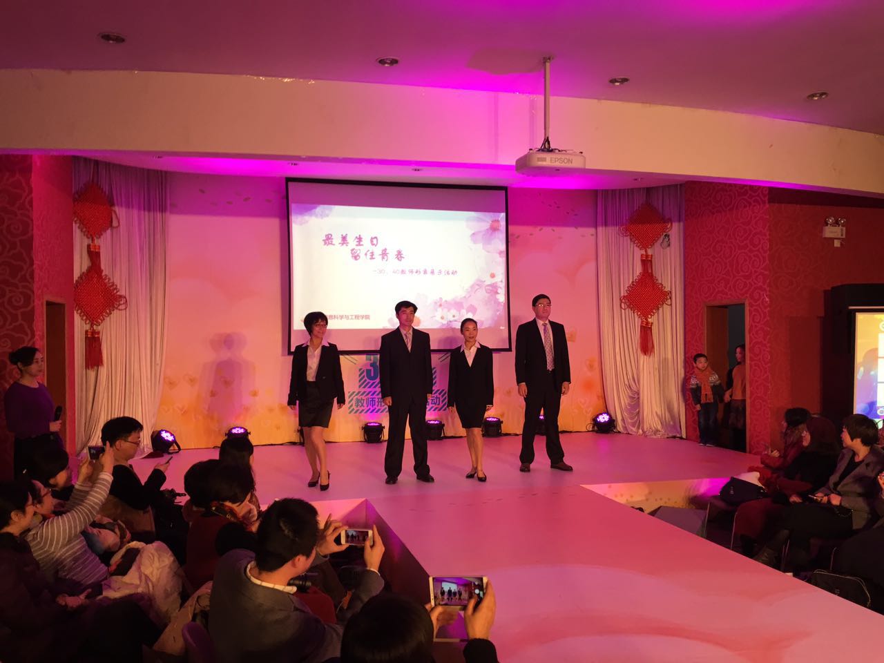 2016年12月16日下午 ,学校工会、人事处在八角亭二楼联合举办“最美生日、留住青春——30、40教师形象展示活动”。kaiyun中国官方网站参加人员有:侍洪波、杜文莉、刘志鹏、万永菁、何高奇、梁莹、杨富琴、韩宇光以及30、40教师钟伟民、刘济、徐震浩、王蓓,、张见、蒋翠玲、冷春霞、常虹、朱远明、李进龙、张海腾、叶琪、付歌等20多名教师参加。其中,由院长杜文莉、副书记刘志鹏、副院长万永菁等13名教师组成的展示队代表学院进行了精彩的T台形象展示演出,先后展示了职业装、亲子装、旗袍装、运动装,伴着优美的音乐,kaiyun中国官方网站代表队大气、优雅、自信的风采赢得台下一阵阵热烈的掌声,最终在全校11支参演队伍中拔得头筹,荣获“最佳展演奖”。