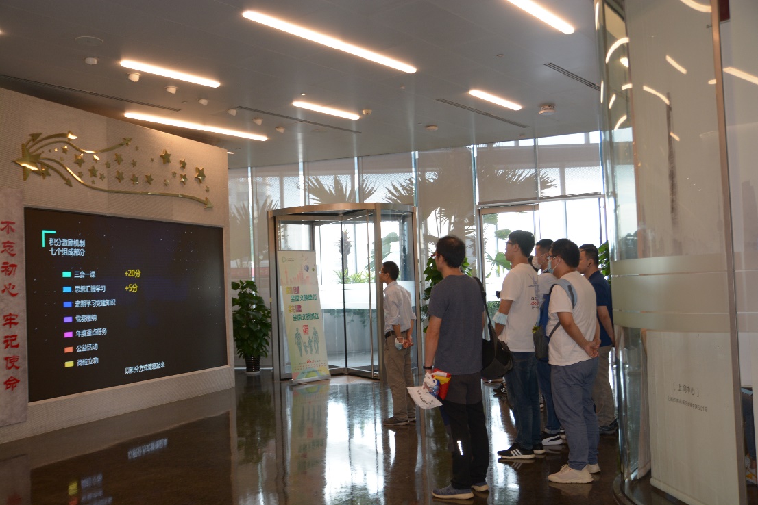 接着,全体党员参观了位于上海中心22层的陆家嘴金融城党群服务中心,习近平总书记曾于2018年来该中心视察。党员们追寻习近平总书记足迹,了解了拥有285座高层楼宇、4万多家企业、50万员工的陆家嘴金融城党建情况,重温总书记嘱托,感悟初心和使命;身临其境,了解了中国第一、世界第二高楼上海中心大厦的建筑之最、绿色技术与智慧人文。