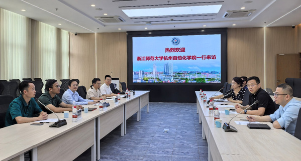 唐漾代表学院对浙江师范大学杭州自动化学院一行来访表示热烈欢迎,介绍了学院机构设置、学生招生培养、教师队伍建设和科研创新成果以及和企业合作情况。郑佳佳感谢学院的热情接待,介绍了浙江师范大学的发展历史以及2025年成立杭州自动化学院的情况,特别介绍了学院人才引进政策,希望能引进更多青年博士毕业生助力学院发展和建设。双方围绕学科建设、人才引进和学生培养等问题展开深入探讨与充分交流,探索具有专业特色、引领前沿发展的学科建设方向。